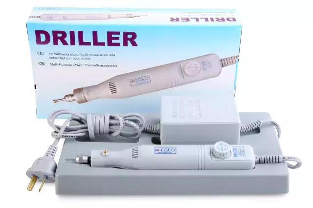 El Torno de Mano Driller EGEO es una herramienta de trabajo multiuso como ser manicuría, pedicuría, podología, mecánica dental, tallado de vidrios y ópticas.